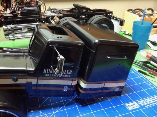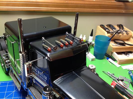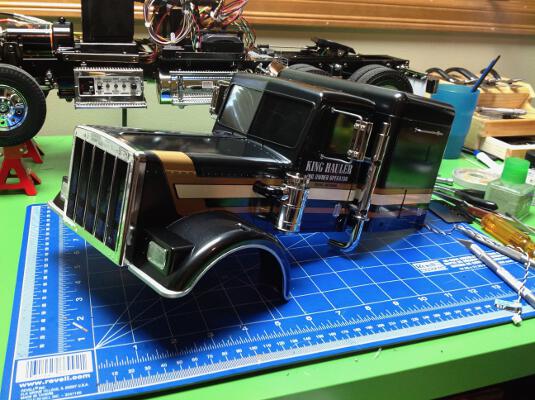 Now the filters, grille, headlights, and exhaust stacks are installed