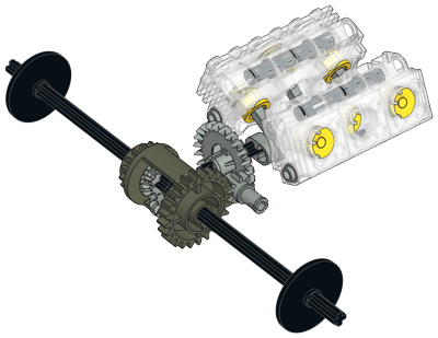 The rear wheels are used to drive a V-6 engine. The engine is made from cylindrical engine elements. The two cylinder banks have a V angle of greater than 90º. The crankshaft is offset 1/2 stud from center, giving the pistons a stroke of 1 stud. Each pair of pistons shares a common crank pin. Because the crank pins are each offset 180 degrees, the forward and back cylinders are synchronized. This can be seen clearly in the animation. In this particular model, the exhaust pipes are simulated with black ribbed hoses. There are only 4 pipes despite the 6 cylinders. The connection between the engine and differential uses a rare crown gear. |