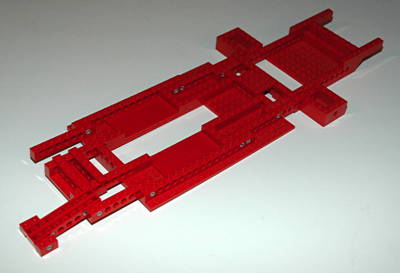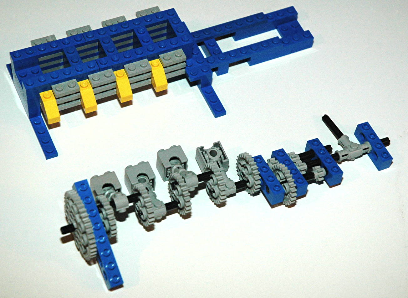 model is quite traditional.The first two images show the engine and transmission assembly. First, they are shown in two parts, upper and lower, followed by the complete assembly. Notice the offset slots on the 24 tooth gears used to make the crankshaft. The third image shows the front bucket seats and the rear bench seat with arm rest. The next series of images show the construction of the chassis.