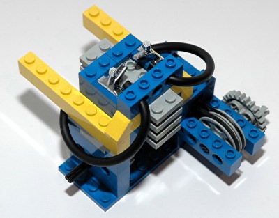 tell it is gasoline? Because it has spark plugs!The engine uses the offset axle holes of the 24 tooth gears to make a crankshaft. Due to the gear design, the crankshaft is flat plane, rather than clocking the crank pins 120° as a real 3 cylinder would do. Connectors placed end to end and clocked 90° form rods which connect to 3 specialized 2x2 square pistons. The "cylinders" are actually square. The engine is driven by a 40 tooth flywheel on the back end. On the front are a pair of pulleys (first seen in this model) which drive belts. One belt drives the fan, while another drives the distributor. Running parallel to the crankshaft is a cam shaft with 4-24 tooth gears. Pins are present in the offset holes of the gears. These pins act as lifters which drive push rods running up to tappets and rockers on the head. The push rods are guided by new 3x2 plates with centered holes at one end. The cam shaft and the crank shaft rotate at the same speed but, due to two pins being in each gear, the rods cycle twice for every rotation of the crank shaft. This makes it kind of like a 4 cycle engine except that the same valve opens twice. Is it an exhaust valve or an intake valve? It doesn't matter. This is the only LEGO® engine with valves of any kind, so I'm just glad they are there. Due to the way the lifters hit the push rods, the engine can only be rotated one direction (clockwise). It will jam in the other direction. There are also a number of aesthetic features which do not actively function. The distributor features spark plug wires which run to each cylinder. Faucet parts are used for plugs. There are air cooling fins on each cylinder. An exhaust manifold runs down one side. This engine is unlike any other made by LEGO® before or since, and is one of my favorites. |