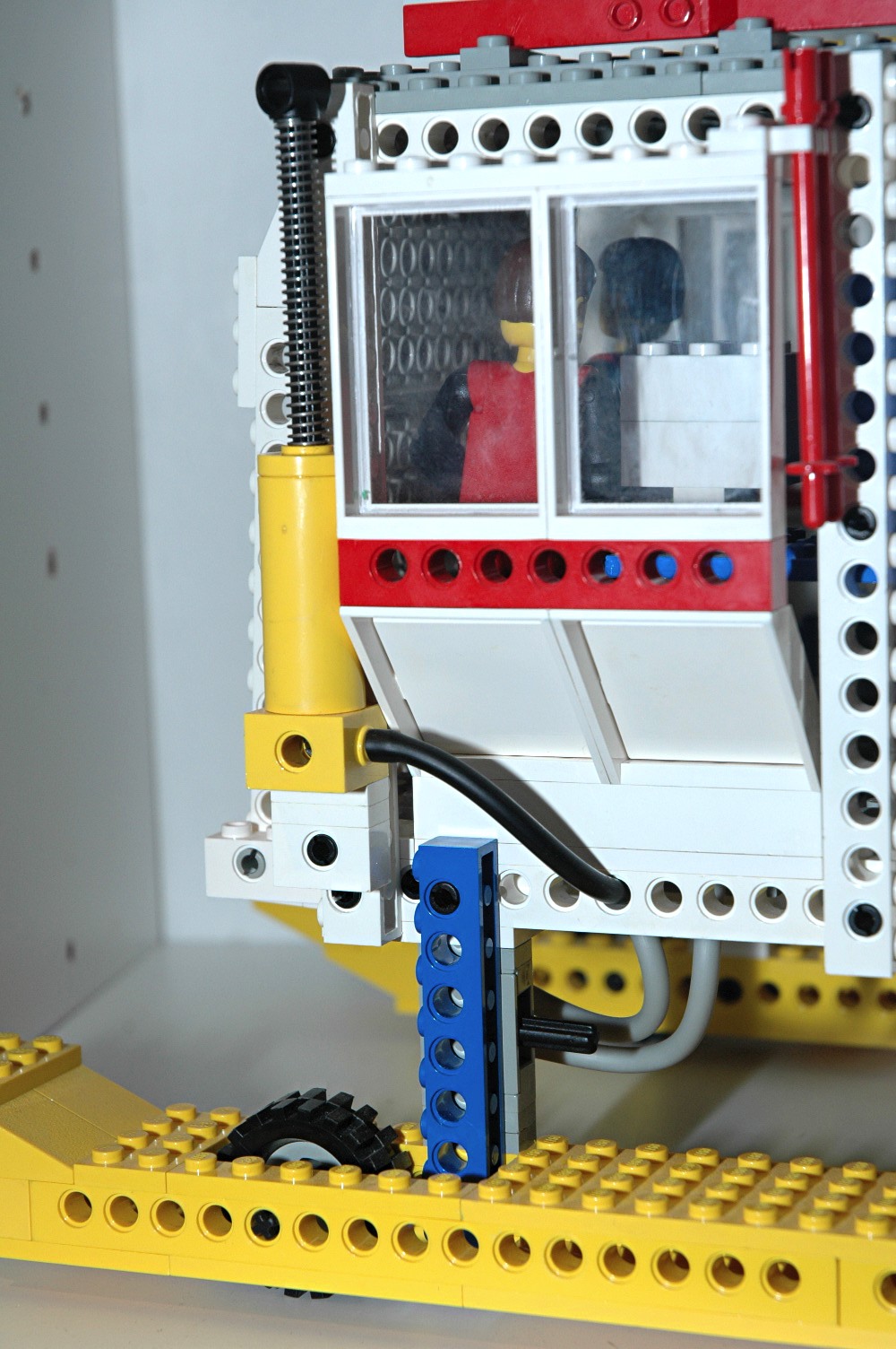 in the beams.A single pump provides air pressure. Depression of the piston produces positive pressure, and raising the piston produces negative pressure (suction), limited by atmospheric pressure. This particular pump uses the longer piston from the 64mm actuator which gives it a longer stroke. The pressure is fed to a distribution block under the floor with an input (pump) and two outputs (switches). One output has a check valve which flows out and the other a check valve which flows in. Each of these is routed to a different inlet of a selector valve (switch) with one output. Selection of the switch in one direction therefore allows pressure output, while selection in the other direction allows suction. Finally, there are two pneumatic actuators connected via a T-connector which have a port at the head end to accept input from the switch. Positive pressure extends the piston, while suction retracts it. This model has the long stroke (64mm) pneumatic actuators which are only found in two models. |