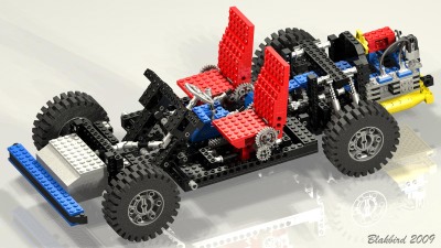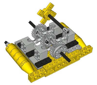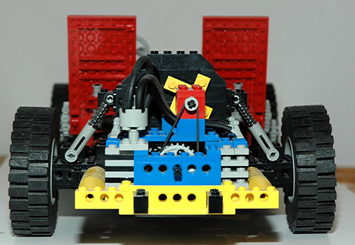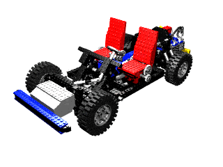 opposing cylinders.The engine uses the offset axle holes of the 24 tooth gears to make a crankshaft. Connectors placed end to end and clocked 90° form rods which connect to 4 specialized 2x2 square pistons. The "cylinders" are actually square. A belt on the rear of the engine drives a fan. The engine also has a number of aesthetic features such as cooling fins (suggesting this engine is air cooled), a distributor, and a pair of exhaust manifolds. There is also a bulkhead forward of the engine which may be either a firewall or a radiator. Ahead of the engine is a 3 speed gearbox / transmission (see color coded computer image). The green axle and 3 spur gears translate forward and aft. The blue axle is driven by the engine and mates with the crankshaft via a 24 tooth gear (not shown). The red axle mates with the 28 tooth ring gear of the differential via the new 14 tooth bevel gear. In 3rd gear (pictured), the path to the wheels is (8/24) x (24/8) x (8/24) x (28/14) = 1:1.5 (overdrive). In 2nd gear, (8/24) x (24/8) x (16/16) x (28/14) = 2:1. In 1st gear, (8/24) x (24/8) x (24/8) x (28/14) = 6:1. The gearbox is not synchronized in any way, so it is difficult to shift gears since they tend not to be aligned. As you can see in the photograph, the shifter only allows two positions (2nd and 3rd). 1st gear is locked out by blocking it with a plate. This is due to the fact the gear ratio is so low that the gear train cannot take the stress if the vehicle is pushed (engine turns 6 times for every turn of the wheels) and tends to skip. If the model is motorized (and therefore driven from the engine instead of the wheels), the shifter is reversed to lock out 3rd instead, since 3rd gear would tend to stall the electric motor. |