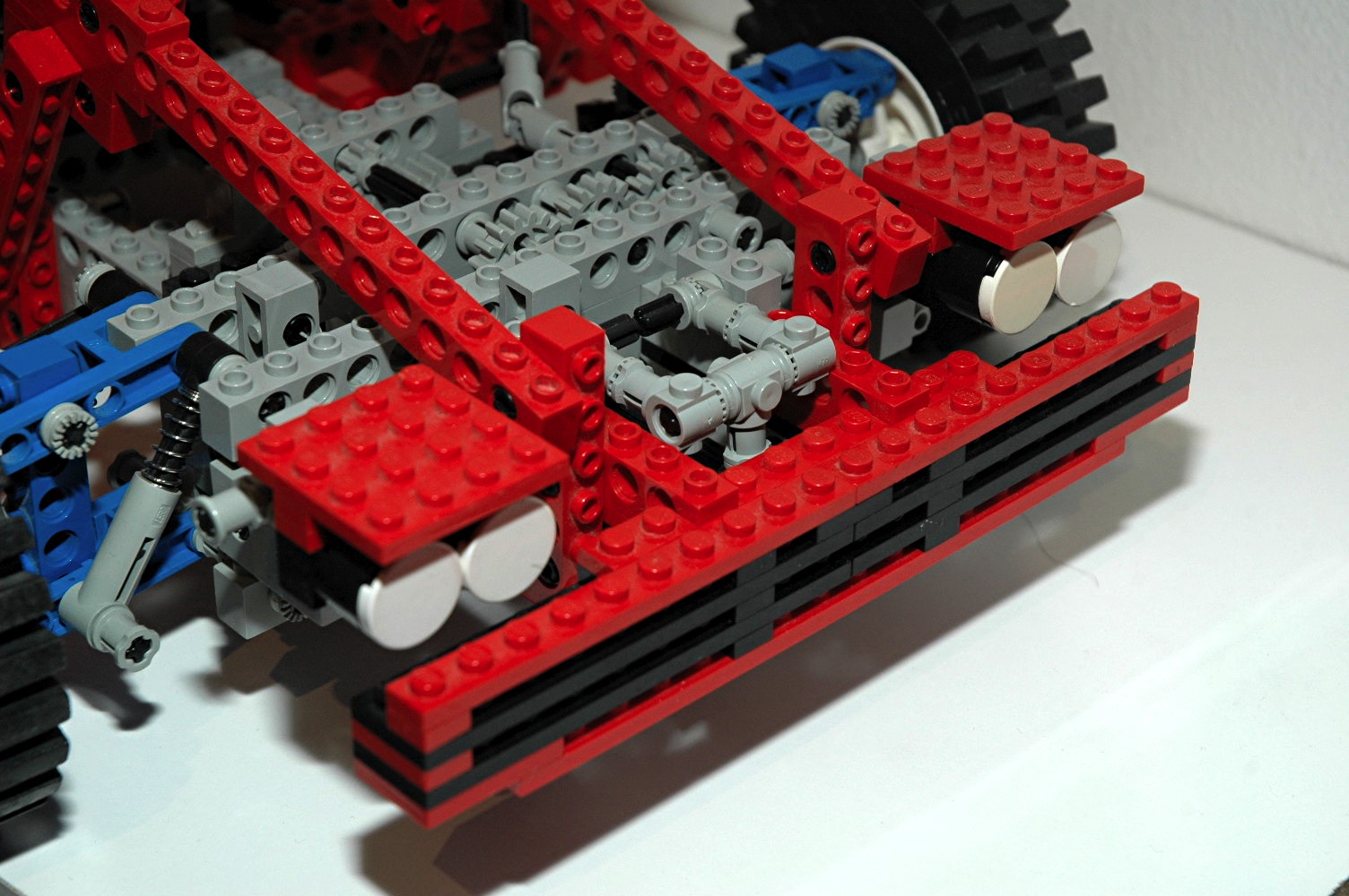 four wheels have independent suspension.The front suspension uses the new control arms parts (blue) and steering arms (white). Upper and lower ball joints form king pins, making this a double wishbone suspension. Because it is a four bar linkage, the wheel stays perpendicular to the ground throughout its travel. A pair of shock absorbers provide support. An extra vertical 6L beam helps support the four bar linkage so that not too much vertical stress is put on the steering arm. The rear suspension could have also used the new control arms, but instead forms the control arms out of four beams. An assembly of plates and beams forms the hub which pivots on longitudinal axles. A pair of vertical two blade rotor parts are used to support the four bar linkage. Power is driven through a pair of universal joints on each side. The pivot point of the u-joints is carefully aligned with the pivot points of the suspension. |