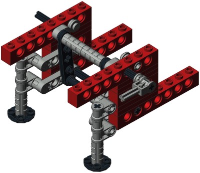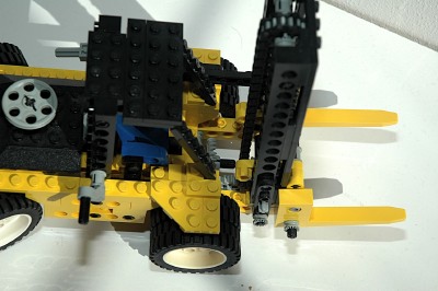 passed through this joint no matter what position the tilt is in.A final pair of 16 tooth spur gears are located at the top and bottom of the fork boom. They are connected by a long chain loop. A single chain link is the wide (tread) variety. This connects to the fork assembly and forces it to follow the chain movement. The fork assembly is one of the least binding of the Technic forklifts. A series of tiles along the front of the boom keep the forks from tipping into the boom, and the flanges on a pair of liftarms keep the forks from tipping away. The semi-round nature of the liftarms keep everything moving smoothly as it slides along the boom. |