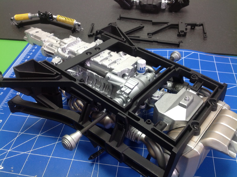 Now the engine assembly is installed. The screws go in from the bottom. As you can see, there is very little clearance to the neighboring parts.The oil filter actually hangs down below the frame which is not good when building because the whole thing balances on it.