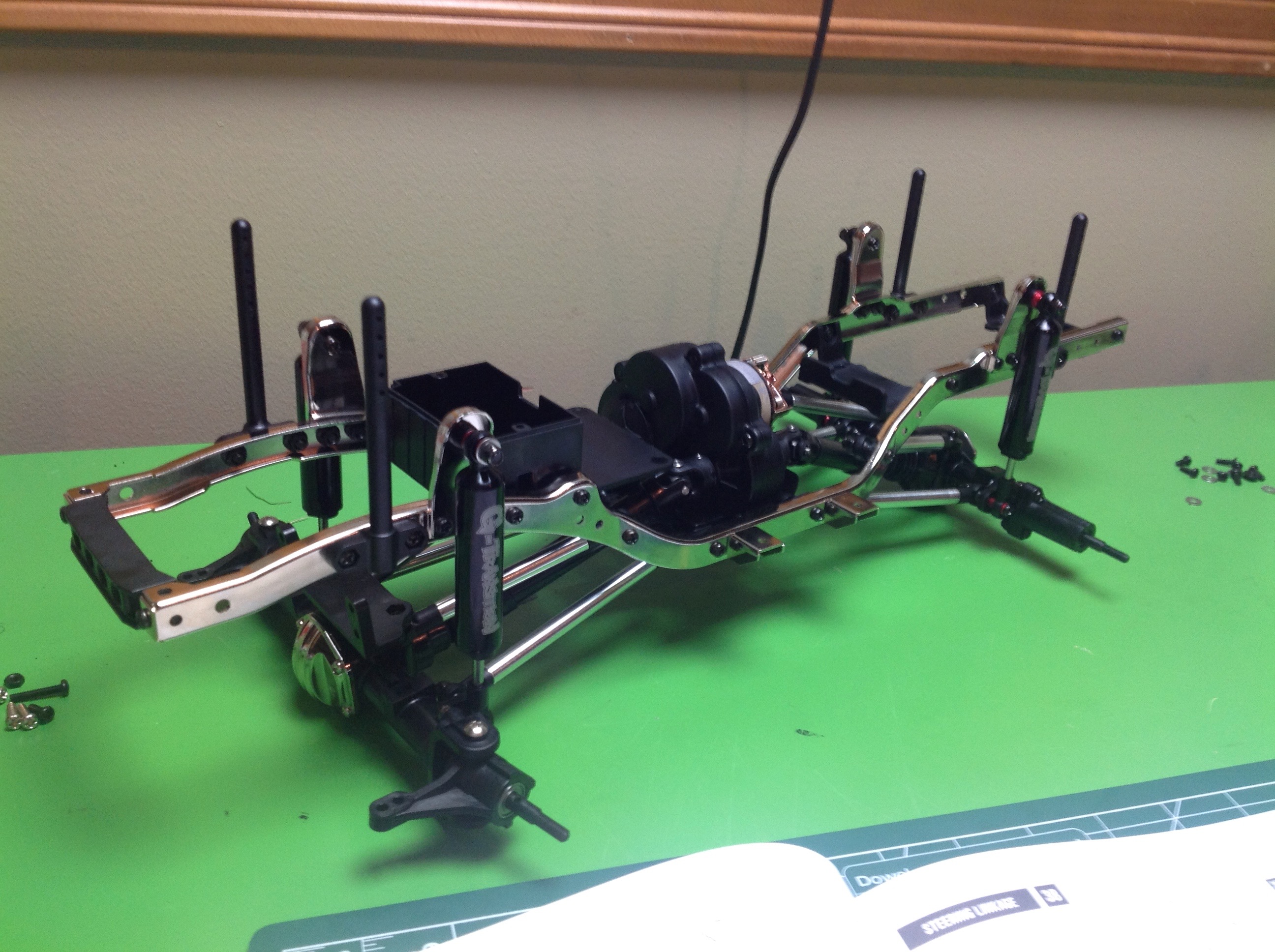 Onto this attach the body posts, shock mounts, and side brackets.