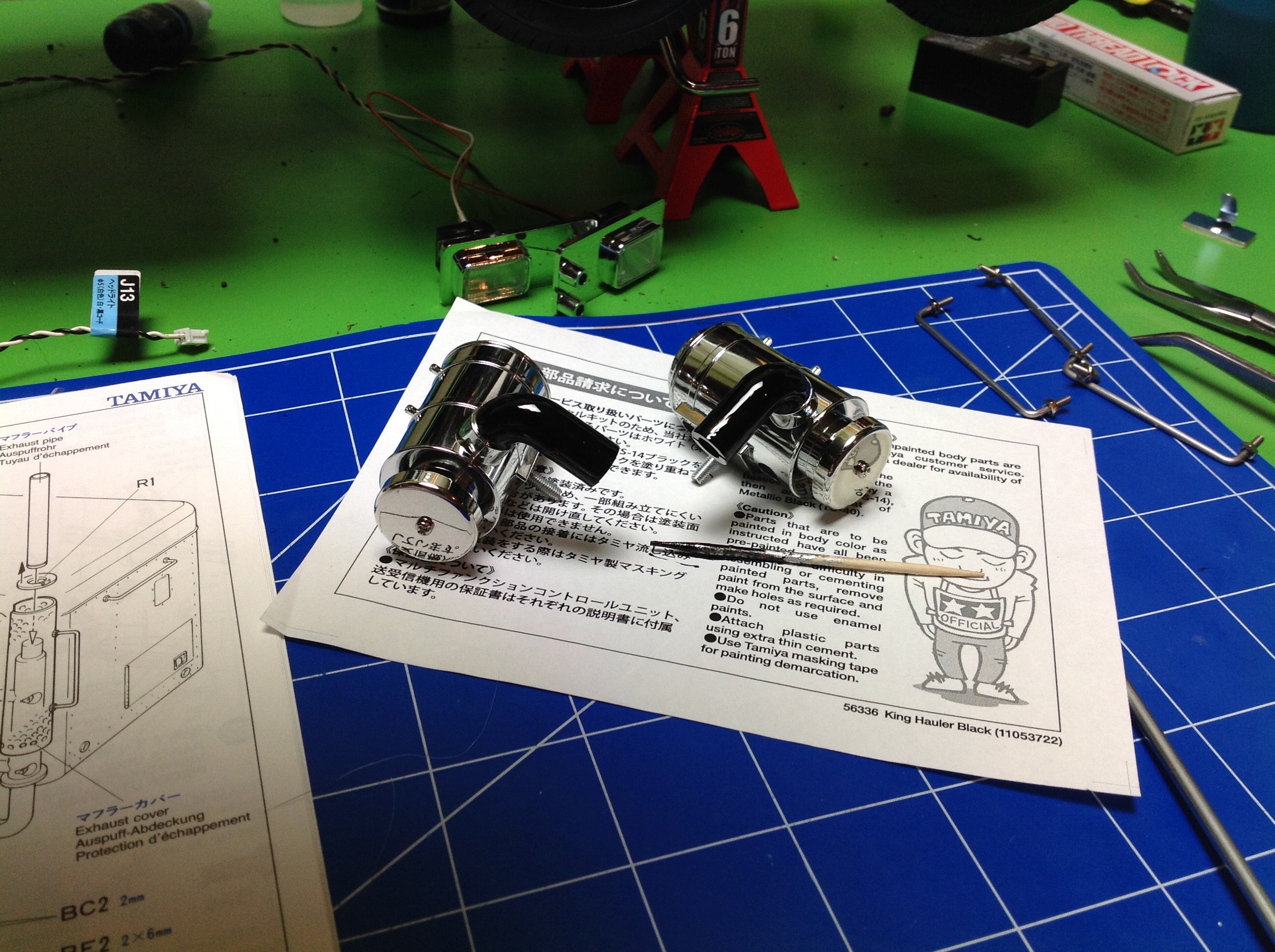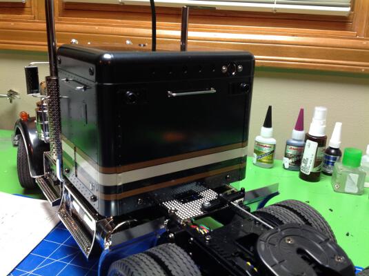 Now the filters, grille, headlights, and exhaust stacks are installed