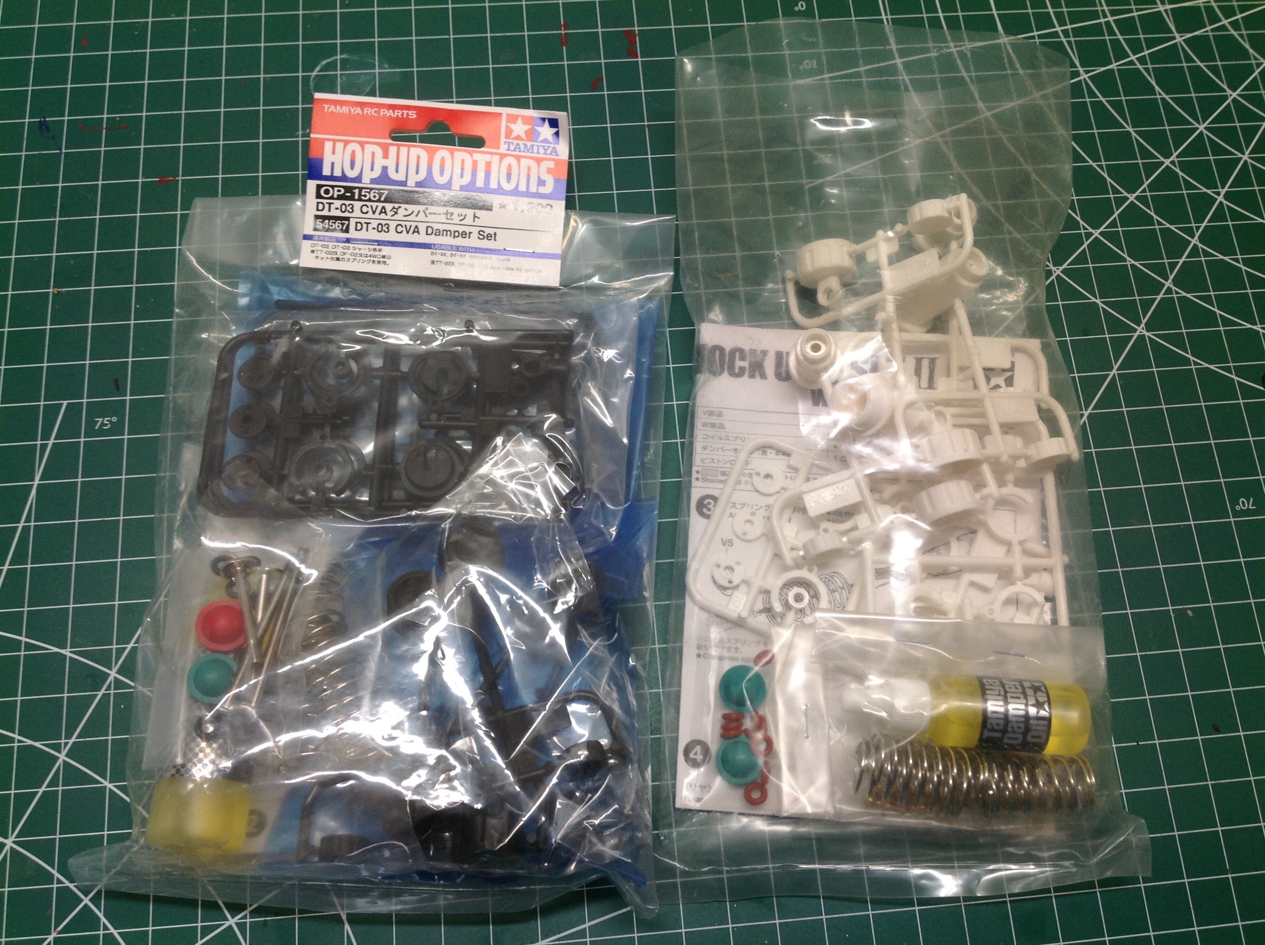 upgrades I did on the Mad Fighter. The picture on the right compares the 4 new shocks (above) with two of the old shocks (below). Not a bad match.