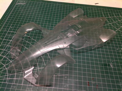Here is the painted main body with the side pods attached and the overspray film removed. On the